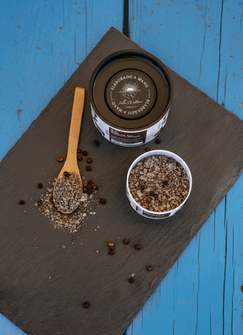 La fusión perfecta entre la delicadeza del mar y el carácter de la especia. Nuestras láminas de flor de sal, cosechadas a mano en nuestros cristalizadores, se mezclan con pimienta negra seleccionada para ofrecer una textura crujiente y un sabor robusto en cada pizca. Esta combinación única transforma tus recetas, añadiendo complejidad y un toque picante a tus creaciones culinarias.