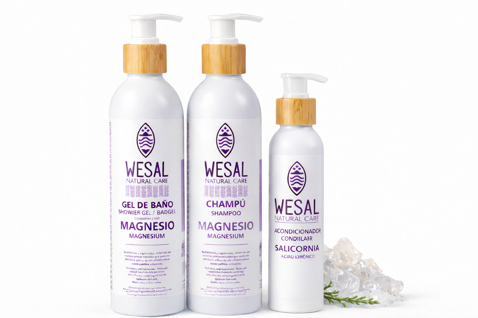 Descubre el ritual completo de bienestar con el pack WESAL que une Gel de Magnesio, Champú de Magnesio y Acondicionador con Salicornia. Una combinación perfecta para cuidar tu cuerpo y tu cabello de forma natural.
